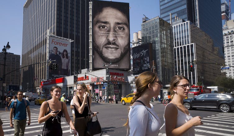 Nike ad in New York in 2018, showing former San Francisco 49ers quarterback Colin Kaepernick after his 2016 kneeling protest. Could a corporation sell an act like Kaepernick’s ‘kneel’ as an NFT?